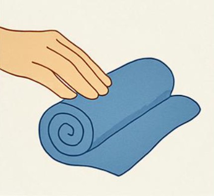 - Enrole a 13 toalha em cilindro, envolva a 2ª ao redor da 1° e repita até formar um rolo grosso com 5-6 toalhas.