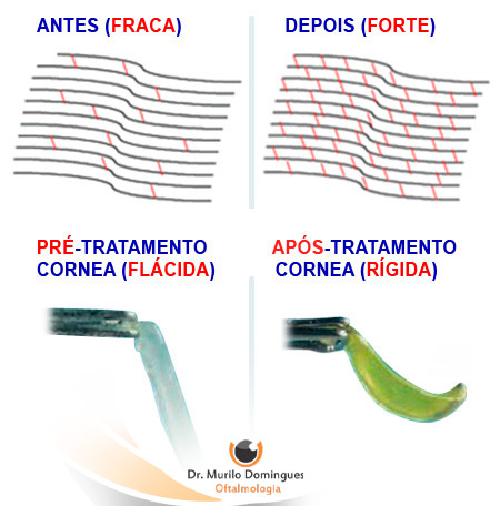 Consiste em utilizar o efeito da interação da radiação UV junto com a riboflavina nas córneas afetadas pelo ceratocone. A luz UV (370mm) associada à riboflavina cria ligações entre as moléculas de colágeno, diminuindo sua maleabilidade. Isso tem o efeito de reduzir a progressão do ceratocone.