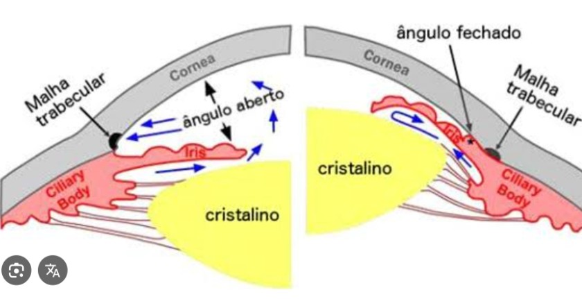 O Glaucoma de Ângulo Fechado ocorre quando a íris se projeta para a frente, bloqueando total ou parcialmente o ângulo de drenagem, o que impede a saída do humor aquoso. Este tipo pode se manifestar de duas formas distintas:
