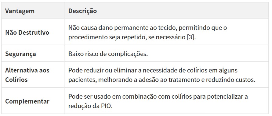 O SLT é um procedimento ambulatorial rápido e com recuperação imediata, oferecendo várias vantagens: