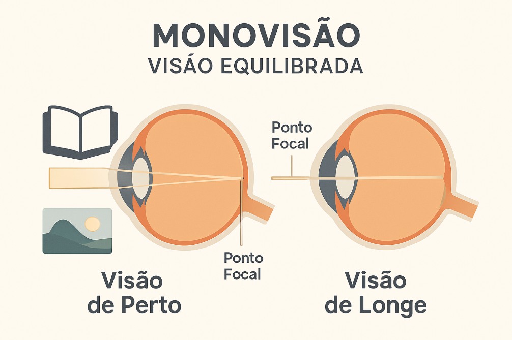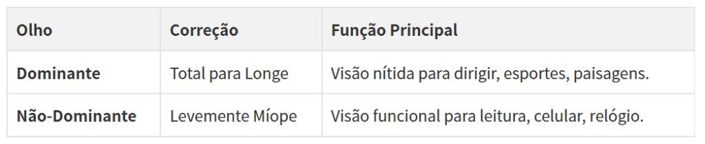- Olho Dominante (Visão de Longe): Este olho é corrigido para que o foco da visão à distância esteja precisamente na retina.